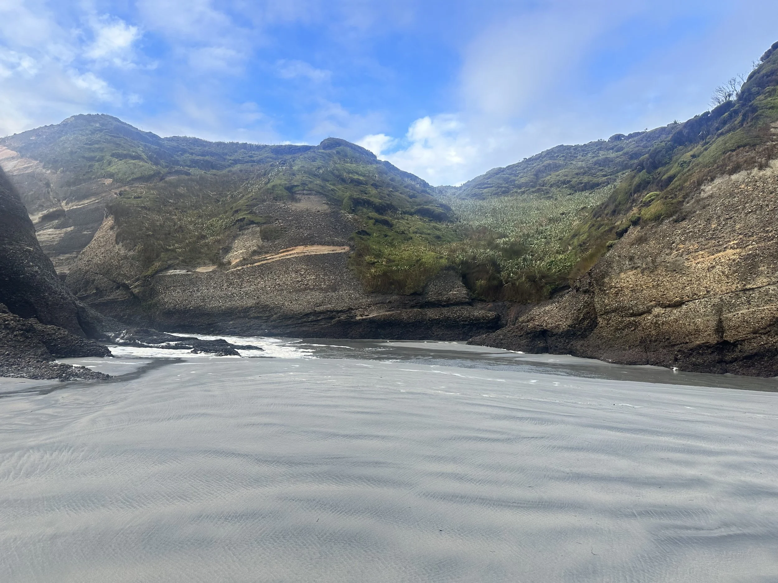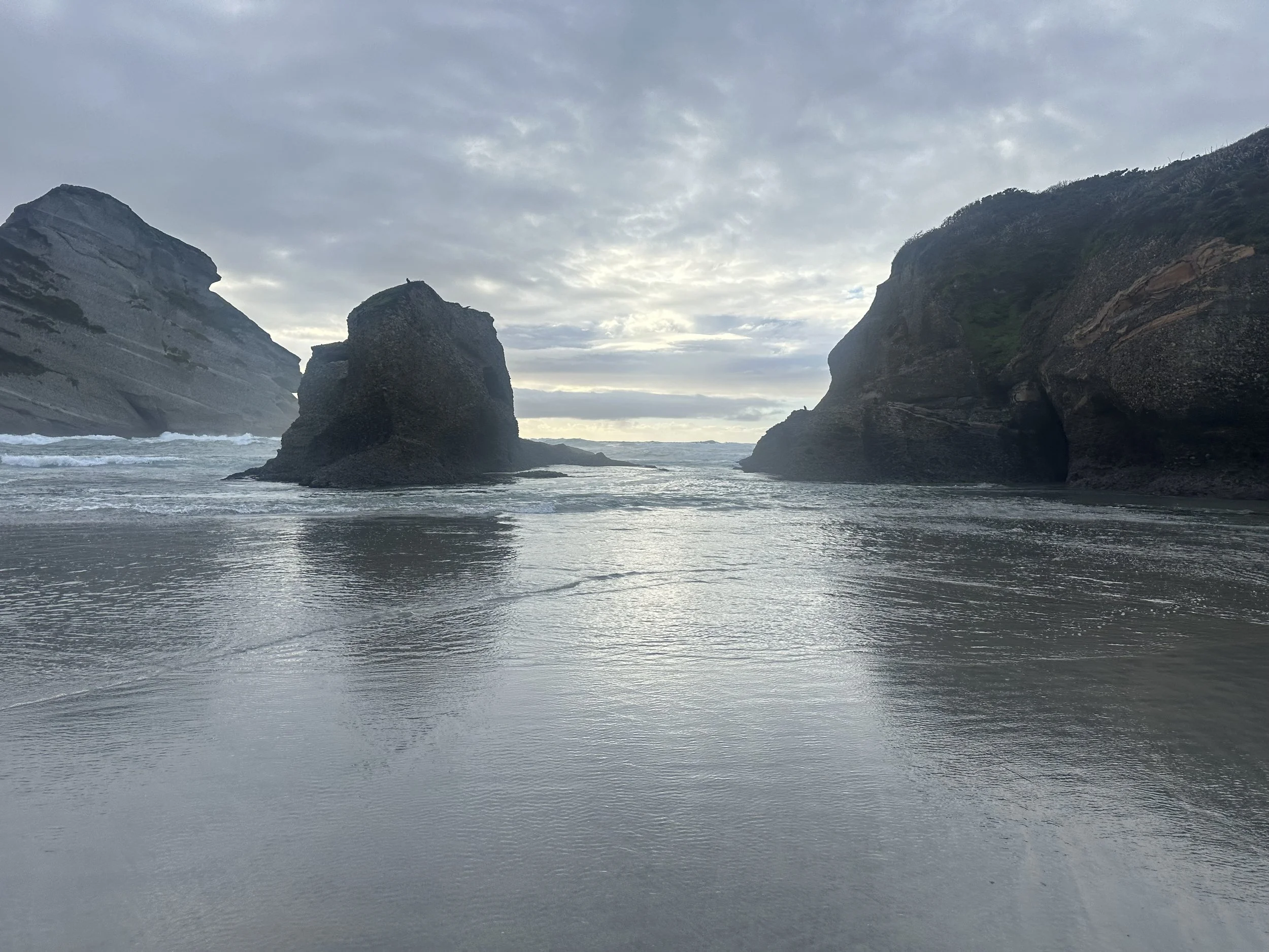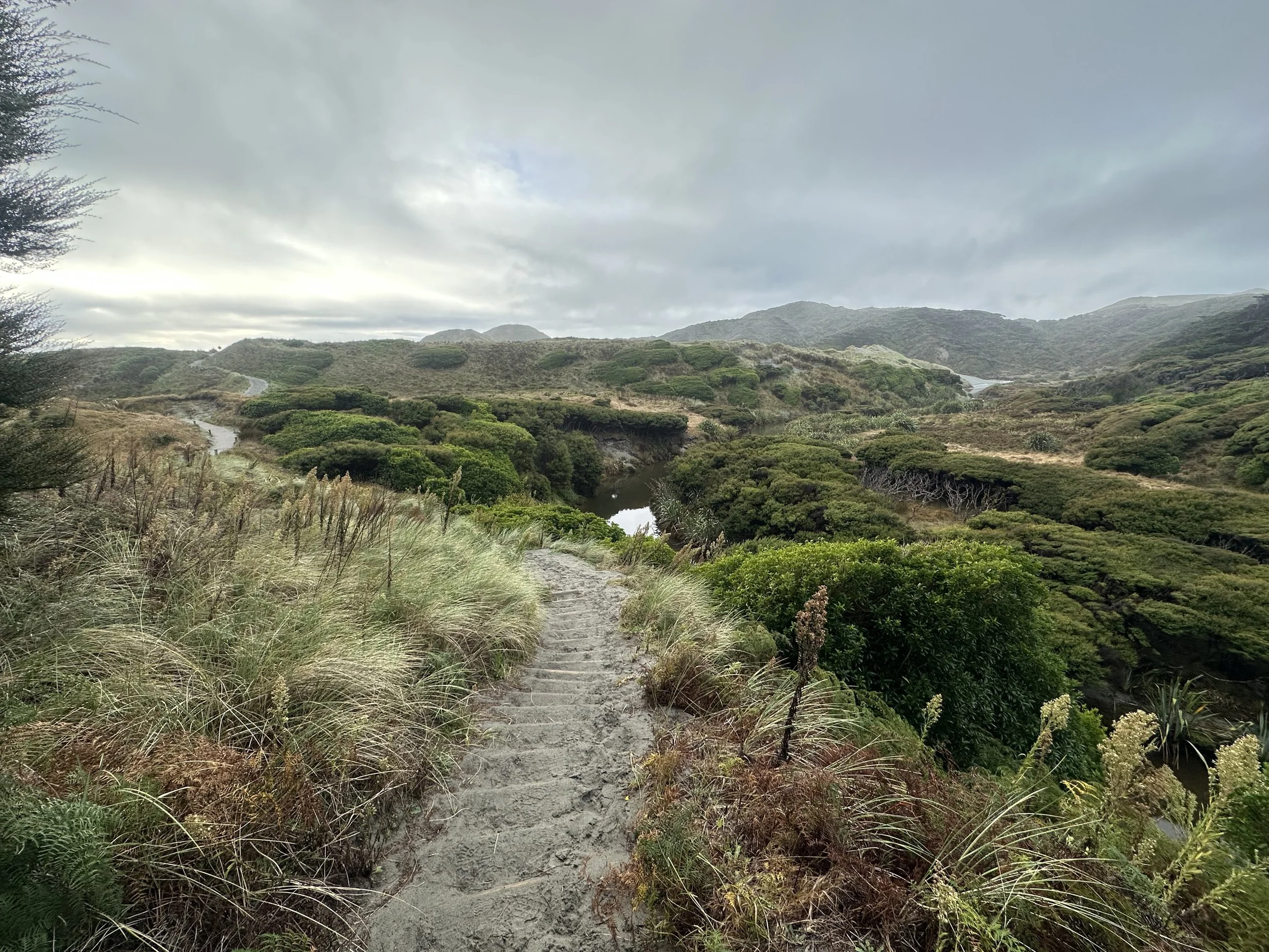 I start the trail.. the pictures I add will be in order from car park to the beach. I know that there is a scenic spot somewhere out there that I’m trying to go see.. but other than that I’m just wandering around and taking it all in. I can hear the ocean roaring.. beautiful rolling hills around me.. the dirt path turns to sand.. the green hills turn to rainforest.. then the rainforest turns to dunes.. there she blows.. a magnificent view of the beach with yuuuugeee rocks.. I feel like almost running at this point in my wee little green huk booties(thank you Mom.. they have been a huge help on this trip) can’t recommend them enough. I’m so excited.. seeing this is a reminder of why I’m doing this trip.. I stressed all week in paradise.. now I get to soak in this paradise. I come across 5 people while on this beach. I can’t believe how empty it is. You put this anywhere in America or Europe.. it would be covered with people. I have all of this before me… to myself. I explore a couple caves. In NZ.. like I’ve said before on here.. there aren’t reptiles, insects, or 4 legged things that can hurt you or mess with you.. so after being here for quite awhile… I guess my guard has been down while hiking because there’s nothing that can get me.. besides my own head;) but I’m in this open shallow/big cave/overhang thing.. a seal! Locks eyes with me at the same time! I spooked him.. he spooked me! He blended in with the rocks.. I was within feet of him with my back turned and didn’t even realize it. we exchanged pleasantries and I apologized for disturbing his slumber.. he huffed and puffed and went back to sleep. I’ve never seen a wild seal.. except for in Astoria, Oregon(goonies film location)