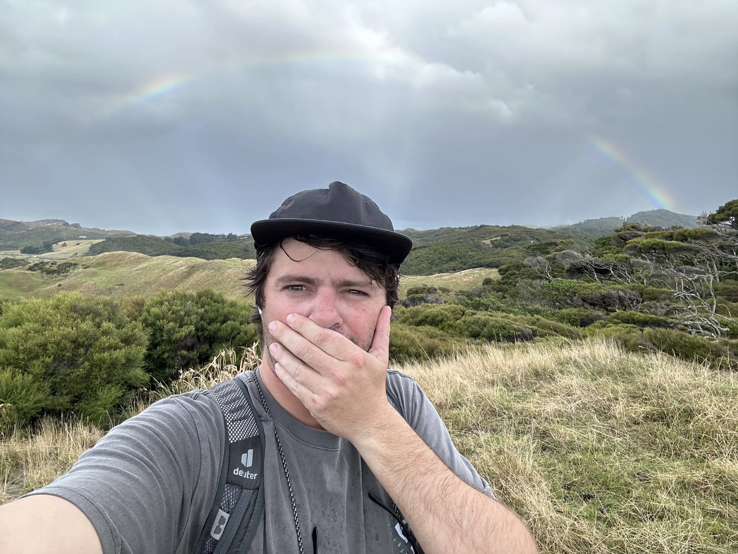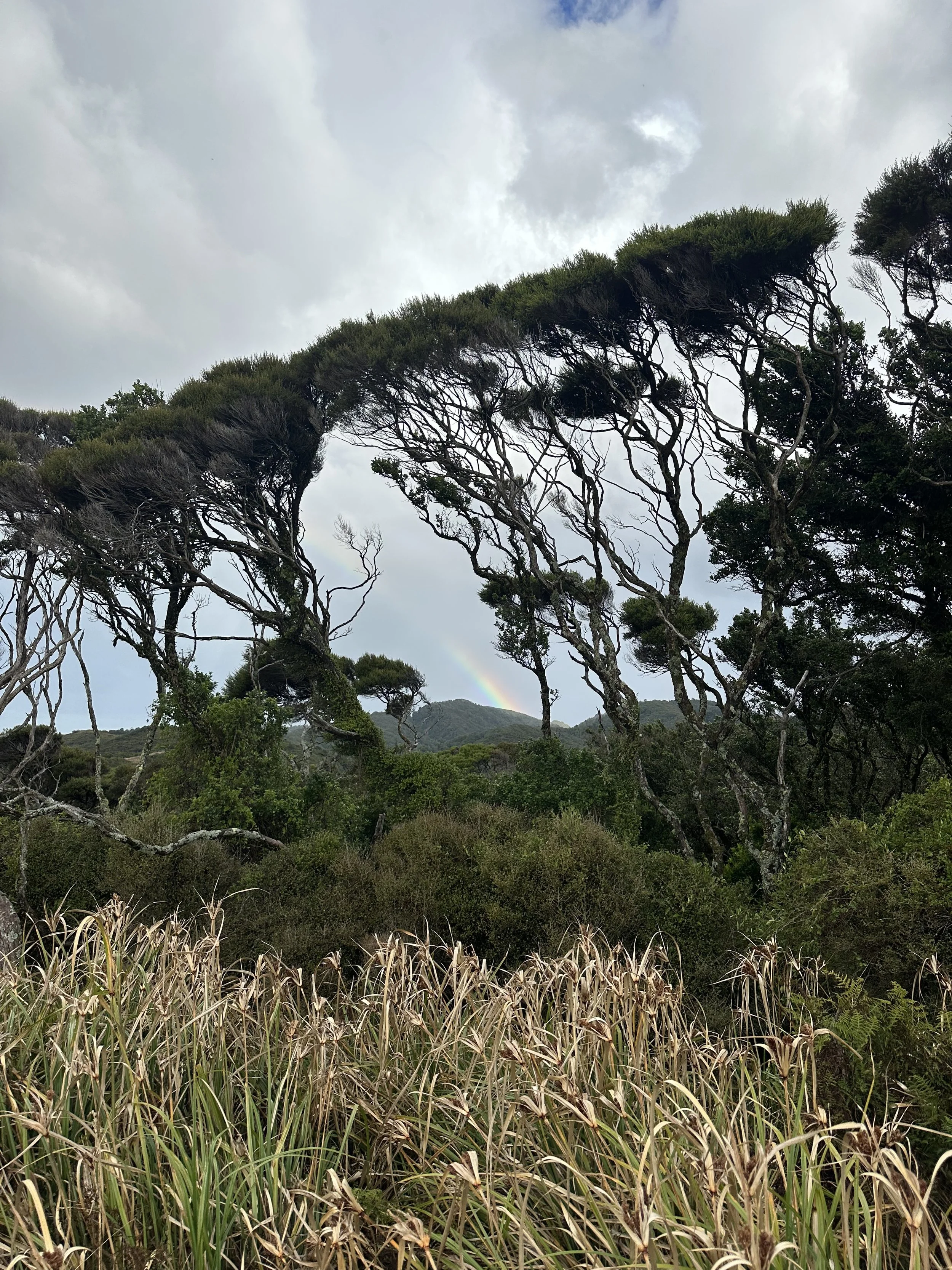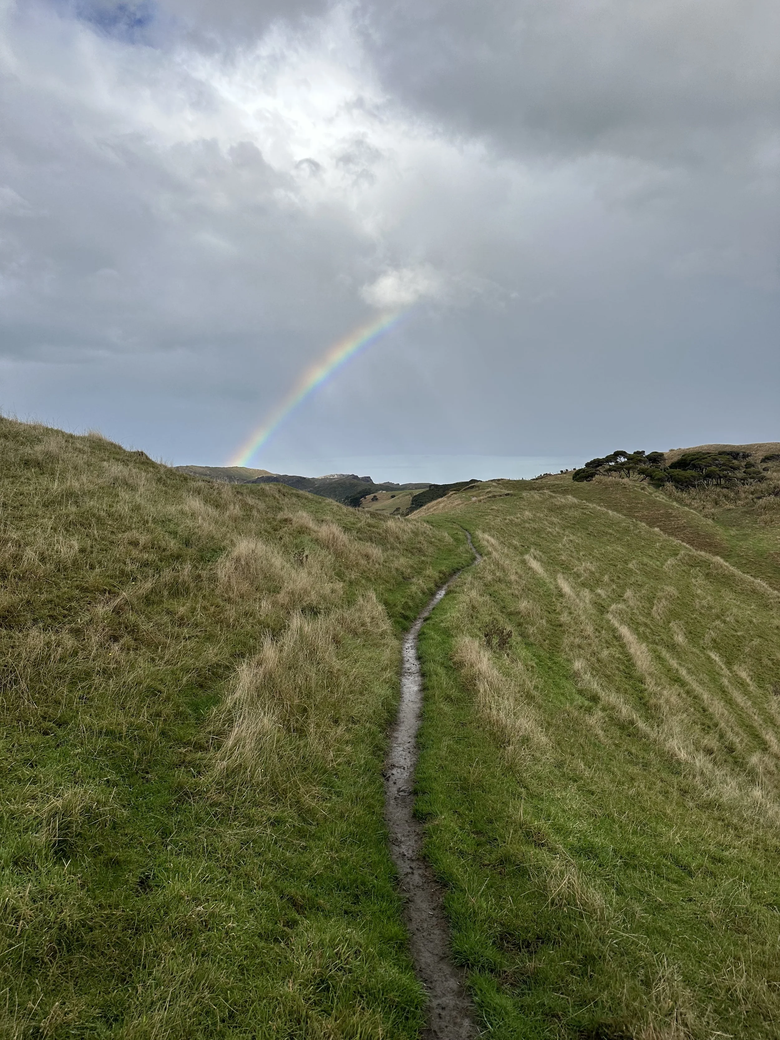 There is still time to go find “the spot”…I allotted about 4ish hours for this journey. I get back on the fading in an out trail…I see at this point where it all ends up at and there is nothing prickly about any plant…or a single ant bed..the only thing slightly unpleasant on the trail is the “sheep poop” but ya know…we don’t even care about that at this point…so we take off the Tevas…we make our own path..barefooted…I go higher this time…and as I reach the top of the ridge…a rainbow..a half rainbow..its the right portion of the rainbow..the left is covered by gray clouds….the sun shines on the massive rocks behind me…I’m walking barefooted on a poop covered ridge..with a rainbow to my right..a rainforest bush to my left..an ocean to my left…and massive rock formations to my left. We love it. The closer I get back to the beginning of the trail…the longer the rainbow gets…the brighter it gets. I feel like I’m chasing this rainbow. I’m watching it stretch…and grow..and become more vibrant in color.
