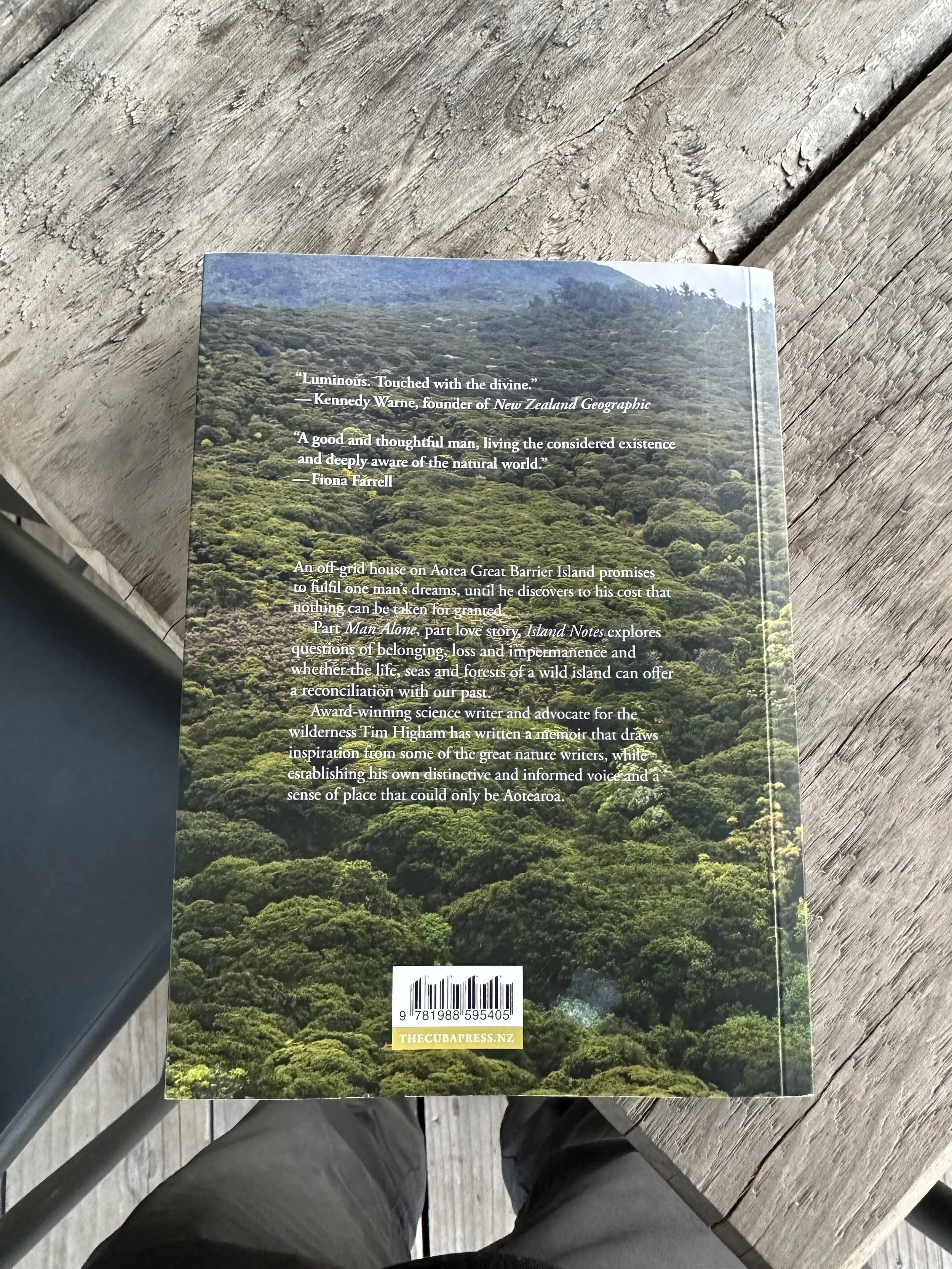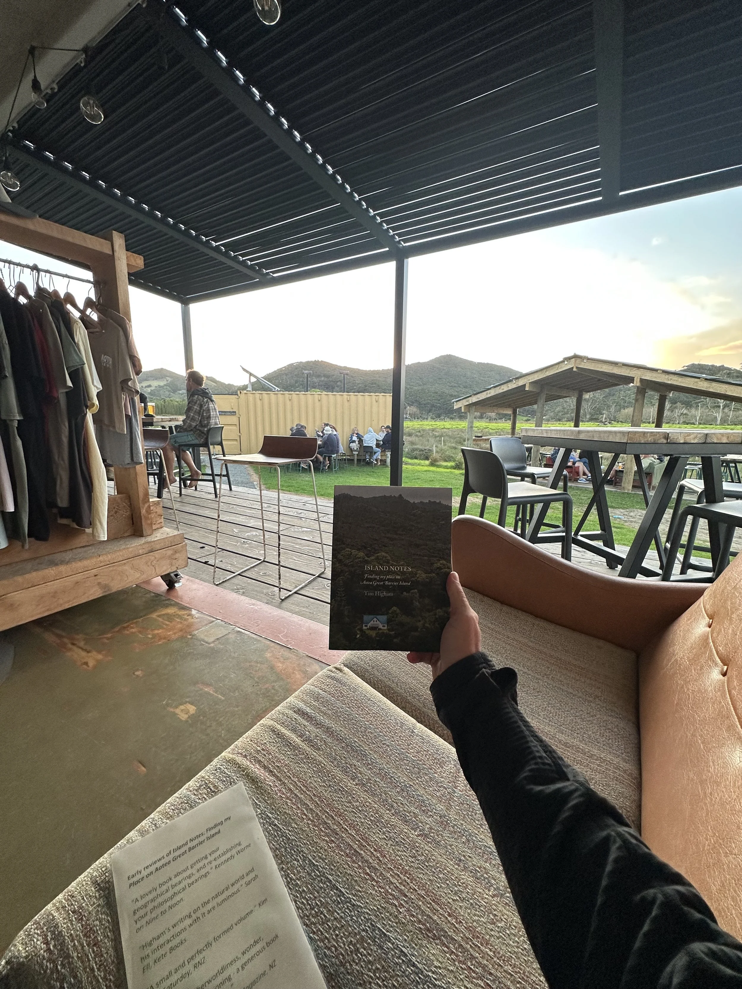 At the counter…I notice the guy serving beer..wearing what looked like a dress…I read the sign below…it reads “Frock Friday!” “Why do we do it? Frock Friday is about not taking yourself or life too seriously. Stop and have a laugh, don’t get hung-up on what others think and enjoy yourself. We are all about raising awareness to mental health. Today we also raise money for the Levi Galaboski Pump track @ Kaitoke school” I chat with them about it…a couple other places do it on the island…and you know…I absolutely love it. I had never seen that idea before…looks like I took that picture at 5:20….what a place to have a beer in this world…Aotea Brewing on the Great Barrier Island in New Zealand. I look around…I see a book…open the book..ask if the book is good to the guy in the frock..he says…ask her. Points at the other blonde working the bar. She says…”well I’m biased because my dad wrote it…and I do think its very good”….I read the back page of it..get the jist of it…I’ve already fallen in love with the island in half a days time and this guy is writing about how he fell in love with it too..and decided to raise his family here. They have been here for around 20 years now.I buy it…it’s called “Island Notes” by Tim Higham….”Finding my place on Aotea Great Barrier Island”….with his house nestled in a green forest paradise on the island…beautiful picture…